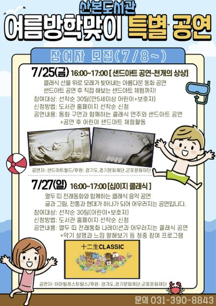 자칫 무료해지기 쉬운 여름방학 기간, 산본도서관에서 펼쳐지는 특별한 공연을 감상하면서 문화 생활의 즐거움과 함께 아이들에게 잊지 못할 추억을 남기기를 기대한다.