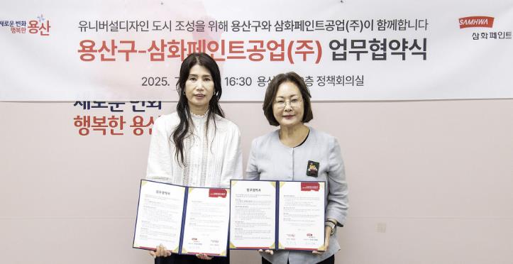 이날 협약식에는 박희영 용산구청장을 비롯해 이상희 삼화페인트공업(주) 컬러디자인센터장, 최성호 용산구 총괄 공공디자이너 등 주요 관계자들이 참석해 포용적 도시환경 조성을 위한 상호 협력 의지를 다졌다.