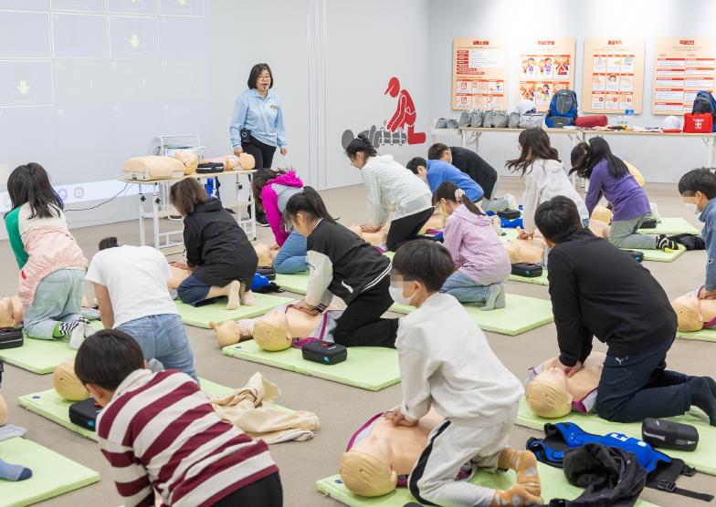 화재안전 체험에서는 연기 대피와 완강기 VR체험을 통해 화재 발생시 행동요령을 익힌다. 보건안전 분야에서는 심폐소생술과 자동심장충격기(AED) 사용법을 실습한다.