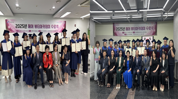 ▲ 2025년 헤어 뷰티아카데미 수료식(왼쪽 상록구, 오른쪽 단원구)에서 수료자들이 기념촬영을 하고 있다. |