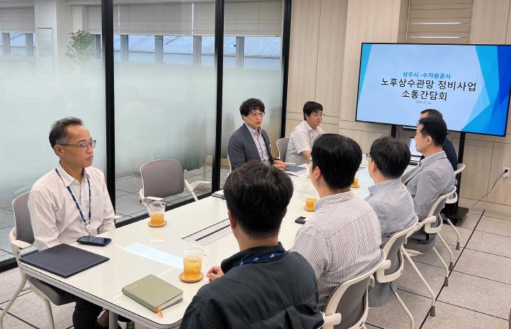 상주시와 수자원공사 경북지역협력단은 지난 6월 노후상수관망 정비사업 위수탁 협약을 체결했고 사업 시행 전 애로사항 공유 및 상생발전 방안을 모색하기 위하여 상수도사업소장, 경북지역협력단장 등 10여 명이 소통 간담회에 참여하여 개선사항 공유에 참여했다.
