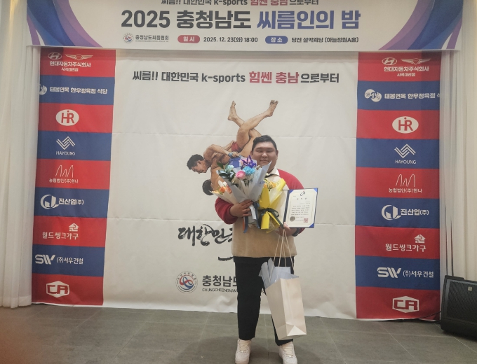 [뉴스스텝] 지난 23일 충남 당진시 A웨딩홀에서 열린 '2025년 충남 씨름인의 밤' 행사에서 청양초등학교 김민규(38) 씨름 감독이 충남교육감 표창을 수상하며 큰 주목을 받았다.