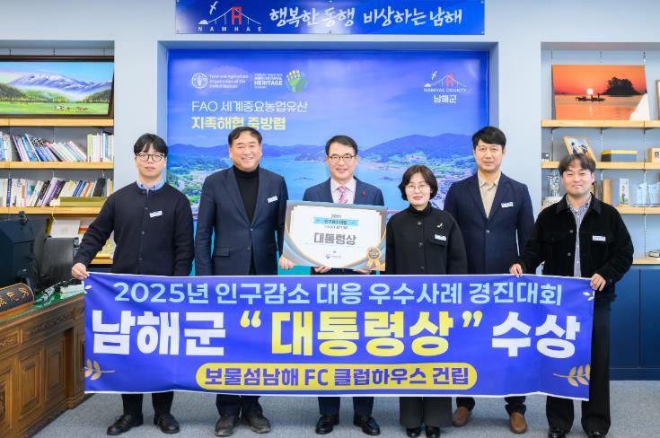 [뉴스스텝] 남해군이 행정안전부가 주관한 ‘2025년 지자체 인구감소 대응 우수사례 경진대회’에서 최고 우수 기초지자체로 선정돼 대통령상을 수상하는 영예를 안았다.