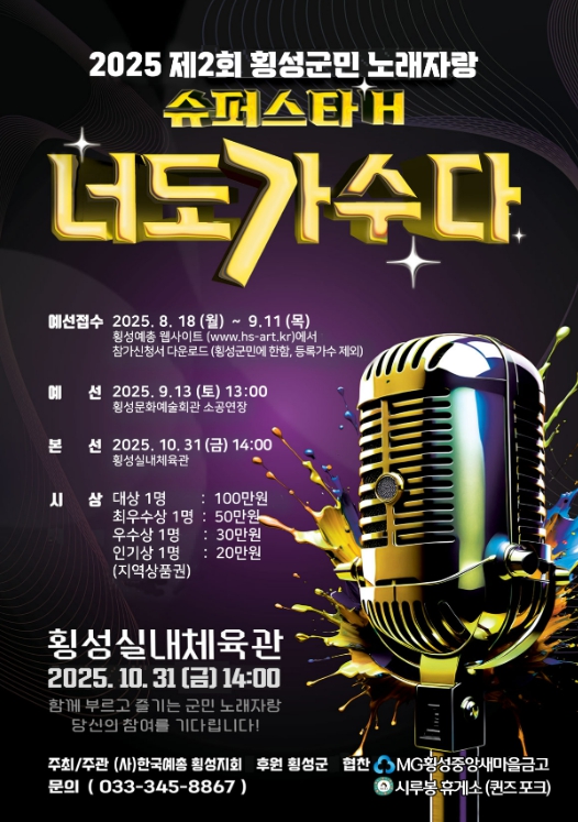 [뉴스스텝] 횡성군민의 숨은 가창력을 뽐내는 축제의 장, ‘2025 제2회 횡성군민 노래자랑 슈퍼스타 H, 너도 가수다’가 오는 10월 31일 오후 2시에 열린다.