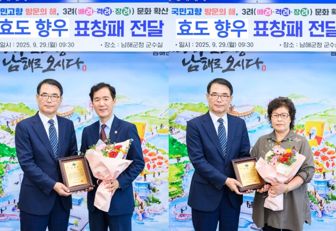[뉴스스텝] 남해군은 9월 29일 군청 대회의실에서 ‘효도 향우 표창패 전달식’을 열고, 고향을 잊지 않고 부모님을 모시며 3려 문화 확산과 고향사랑 실천에 기여한 향우에게 표창패를 전달했다.