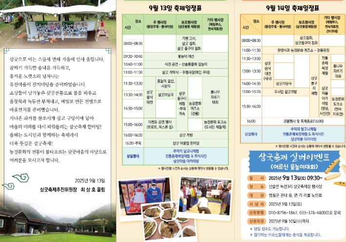 이번 축제는 9월 13일 11시 개막식을 시작으로, 오후 4시에는 삼굿 개방 및 무료 나눔 행사가 진행된다.