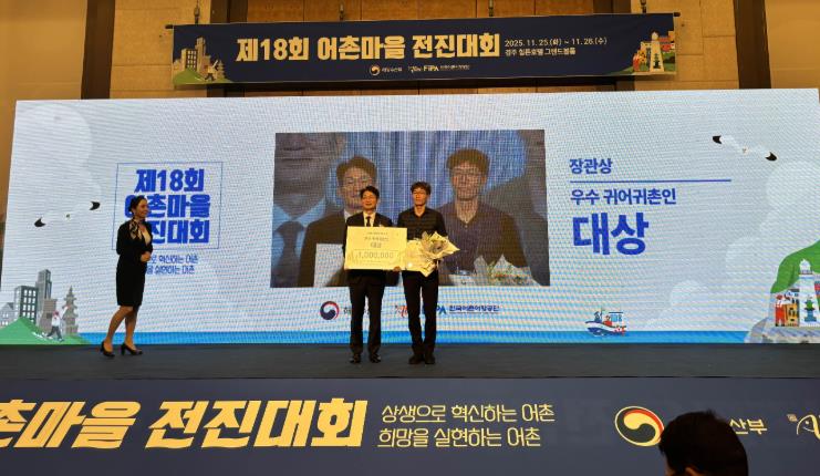 [뉴스스텝] 전라남도해양수산과학원은 오늘 경주에서 열린 제18회 어촌마을 전진대회에서 2020년 전남귀어학교 제2기 수료생인 완도 김진호(46) 씨가 우수 귀어귀촌인 대상에 선정돼 해양수산부 장관 표창을 받았다고 밝혔다.