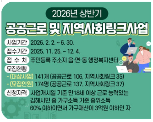 [뉴스스텝] 김해시는 25일부터 다음 달 4일까지 ‘2026년 상반기 공공근로 및 지역사회링크사업’ 참여자를 모집한다.
