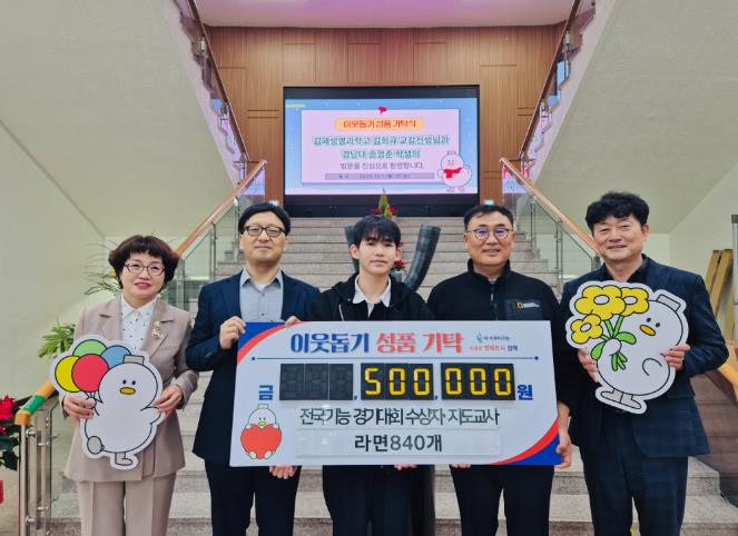 [뉴스스텝] 김해시는 2일 전국기능경기대회 수상자와 지도교사가 수상을 기념해 라면 840개(50만원 상당)를 기탁했다고 밝혔다.