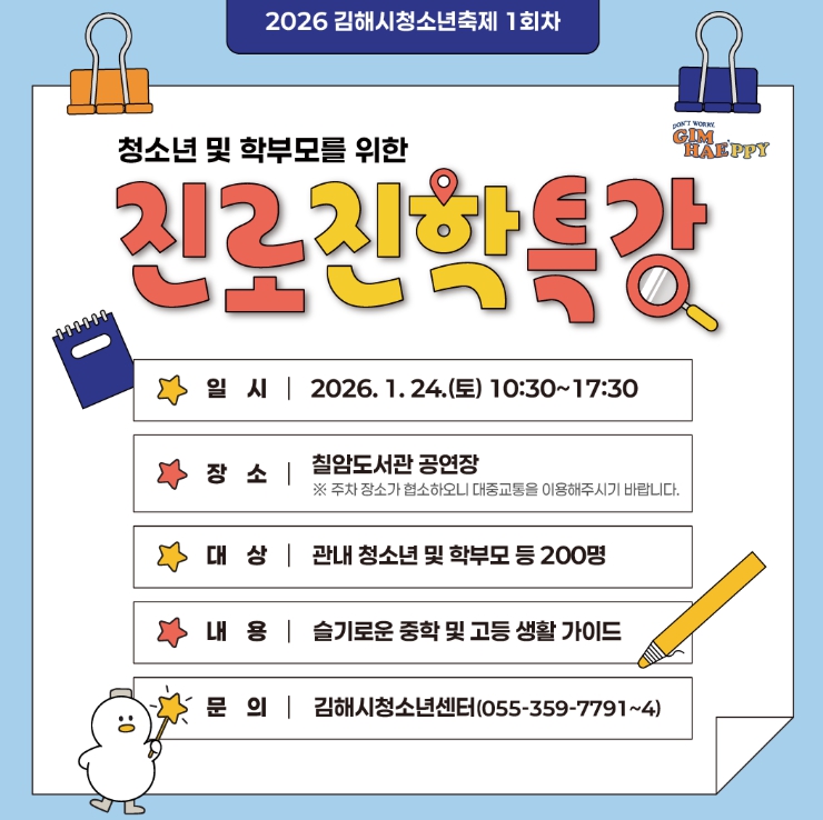 [뉴스스텝] 김해시청소년센터는 오는 24일 칠암도서관 공연장에서 청소년과 학부모를 위한 ‘2026 청소년 진로·진학특강’을 개최한다고