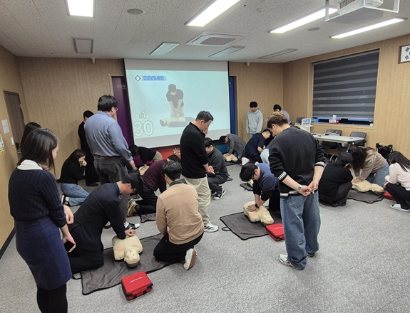 교육은 재단 대회의실에서 진행됐으며, 직원들은 다양한 사례를 바탕으로 △올바른 소화기 사용법 △상황별 응급처치 방안 △심폐소생술(CPR)방법 △자동제세동기(AED) 사용법 등을 이론으로 학습한 뒤, 마네킹과 자동제세동기(AED) 장비를 이용해 실습을 진행했다.