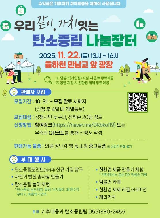 [뉴스스텝] 김해시는 김해시기후환경네트워크와 함께 오는 22일 율하유적전시관 앞 광장 일원에서 ‘우리 같이, 가치 잇는 탄소중립 나눔장터’를 개최한다고 20일 밝혔다.