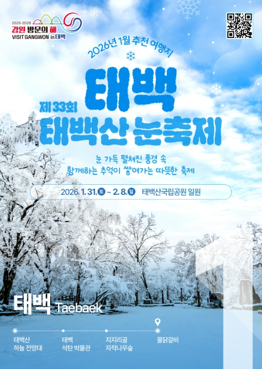 이번 ‘1월 추천 여행지’ 선정에 따라 태백시는 태백산 눈축제를 중심으로 겨울철 관광 콘텐츠를 집중 홍보해 겨울 관광객 유입을 본격적으로 확대할 계획이다.