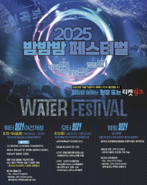 8월 15일부터 16일까지, 칠곡보 야외 물놀이장과 주차장, 오토캠핑장을 무대로 ‘워터밤’, ‘모터밤’, ‘캠핑밤’이 차례로 펼쳐진다. 시원한 물줄기와 음악, 화려한 슈퍼카, 반짝이는 별빛까지… 여름밤의 낭만과 짜릿함이 한자리에 모인다.