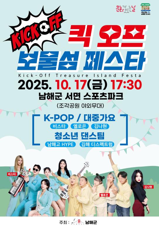 김지영 남해군 문화체육과장은 “킥 오프! 보물섬 페스타는 군민 모두가 즐길 수 있는 청춘·열정·화합의 무대가 될 것”이라며, “음악과 춤이 어우러진 공연을 통해 세대 간 공감과 소통의 장을 만들 것으로 기대되니 많은 분들이 함께해 주시면 좋겠다”고 밝혔다.
