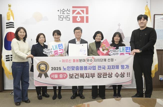 [뉴스스텝] 서울 중구가 보건복지부 주관 ‘2025 노인맞춤 돌봄서비스 지자체 평가’에서 ‘우수’지자체로 선정돼 보건복지부 장관상을 수상했다. 구는 지역 돌봄 체계를 강화하고 스마트 기술을 도입해 어르신 일상 밀착 돌봄을 지원하며 높은 평가를 받았다.