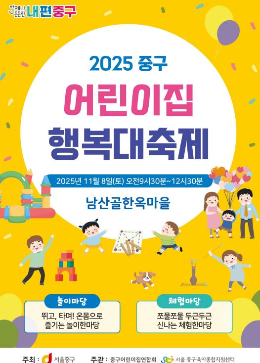 [뉴스스텝] 서울 중구는 오는 11월 8일 토요일 오전 9시 30분부터 12시 30분까지 남산골 한옥마을 천우각 광장 일대에서 '2025 중구어린이집 행복대축제'가 개최된다고 밝혔다.