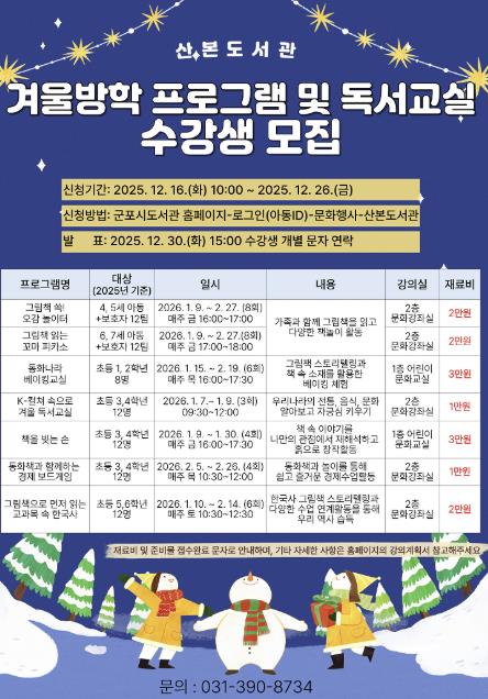 참가 신청은 2025년 12월 16일부터 12월 26일까지 군포시도서관 홈페이지에서 선착순으로 마감된다.