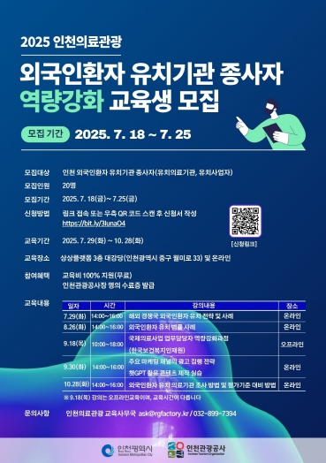 '인천 외국인환자 유치기관 종사자 역량강화 교육'은 7월 29일(화)부터 10월 28일(화)까지 총 15시간 진행되며, 인천 외국인환자 유치기관 종사자를 대상으로 한다. ▲해외 경쟁국 외국인환자 유치 전략 및 사례 ▲유치의료기관평가인증제도(KAHF) 이해 및 실무 ▲마케팅 채널별 광고 운영 전략 및 콘텐츠 제작 실습 ▲외국인환자 유치 법률 실무 등을 다룬다.