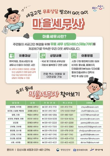 마을세무사 제도 이용을 원하는 시민은 안산시청 누리집이나 시청·구청·행정복지센터 등에 비치된 홍보물, 민원콜센터(166-1234) 등을 통해 거주 동을 담당하는 세무사 명단을 확인한 후 전화·방문·팩스 등으로 상담을 신청하면 된다.