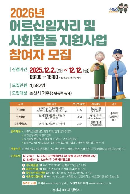 [뉴스스텝] 논산시는 2026년도 어르신일자리 및 사회활동 지원사업 참여자를 오는 12월 2일부터 12일까지 모집한다고 밝혔다.