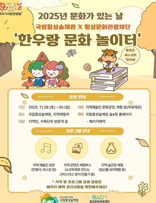 [뉴스스텝] 산림청 한국산림복지진흥원국립횡성숲체원은 오는 11월 29일부터 30일까지 횡성 지역민 및 문화소외계층을 대상으로 ‘25년 강원특별자치도 문화가 있는 날 구석구석문화배달사업 – 한우랑 문화놀이터’를 개최한다고 밝혔다.