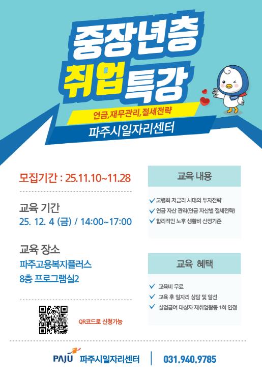 [뉴스스텝] 파주시는 오는 11월 10일부터 28일까지 ‘중장년층 취업 특강’에 참여할 교육생 15명을 선착순으로 모집한다.