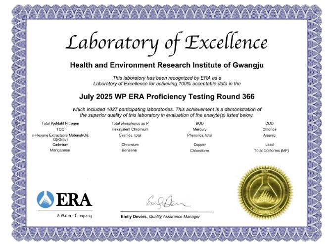 [뉴스스텝] 광주광역시 보건환경연구원이 최근 미국 환경자원협회(ERA)가 주관한 수질분야 국제 숙련도시험에서 전 항목 ‘만족(Satisfactory)’ 판정을 받아 ‘2025 최우수 분석기관(Laboratory of Excellence)’으로 선정됐다.