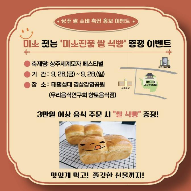 이벤트 행사는 9월 26일부터 9월 28일까지 진행되는 상주세계모자 페스티벌과 10월 18일부터 10월 19일까지 진행되는 상주슬로라이프 페스티벌 두 번에 걸쳐서 추진할 계획이다. 행사 장소는 축제장 내 우리음식연구회 향토음식 판매부스며, 3만원 이상 주문 시 ‘미소진품 쌀 식빵’을 축제기간 중 매일 50개씩 총 250개를 선착순으로 무료 증정할 예정이다.