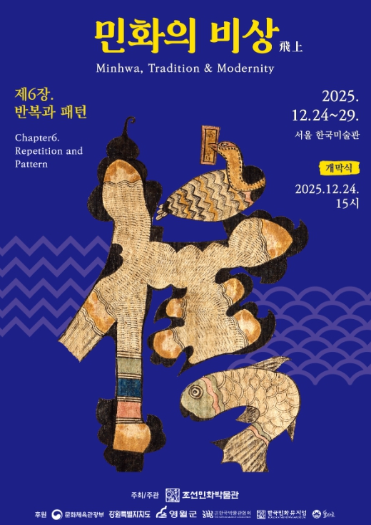 이번 여섯 번째《민화의 비상 - 반복과 패턴》展은 예년과 같이 역대 ‘전국 민화 공모전’ 수상자 단체인 ‘민수회’ 회원과 전국의 민화 작가들을 대상으로 공모와 평가로 선정된 출중한 실력을 지닌 36인의 새로운 작품과 조선민화박물관 소장품 중 반복과 패턴이 극대화된 전통 민화를 함께 선보인다.