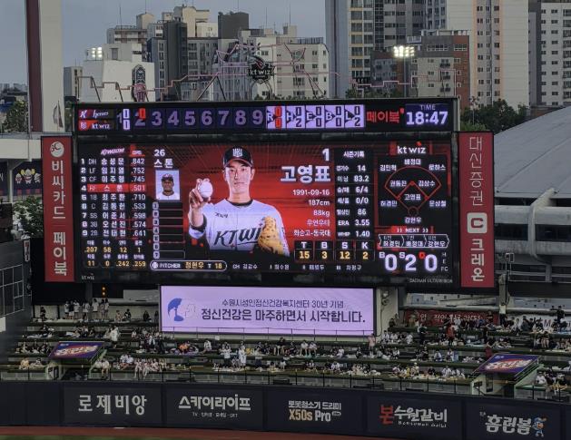 ▲ 수원KT위즈파크 전광판에 ‘정신건강은 마주하면서 시작합니다’ 메시지가 송출되고 있다. |