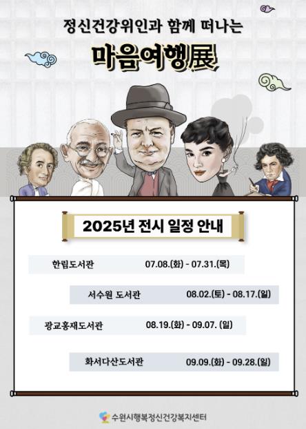 ‘정신건강 위인과 함께하는 마음여행展’은 2018년부터 수원시청, 호매실도서관, 장안구청 등에서 이어지고 있는 시민 정신건강 인식 개선 문화사업 중 하나다. 아동·청소년부터 성인까지 전 연령층이 함께할 수 있는 전시로 운영된다. 자세한 내용은 수원시행복정신건강복지센터 홈페이지와 SNS에서 확인할 수 있다.