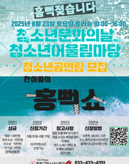 [뉴스스텝] 홍천군 청소년수련관은 청소년 어울림마당과 청소년 문화의 날 행사를 연계한 ‘청소년 물놀이 축제’를 오는 8월 23일 도시산림공원 토리숲에서 개최한다.