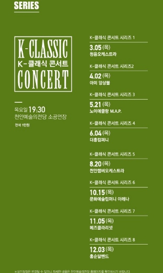 K-클래식 콘서트는 총 8회로, 소공연장에서 관객과 가까이 호흡하는 무대로 운영된다. 내달 ‘청음오케스트라’를 시작으로 △4월, 아미 앙상블 △5월, 노이에클랑 M.A.P △6월, 더흥컴퍼니 △8월, 천안챔버오케스트라 △10월, 문화예술컴퍼니 아레나 △11월, 메즈클라리넷 △12월 홍순달 밴드까지 장르와 구성의 폭을 넓힌 다채로운 무대가 이어질 예정이다.