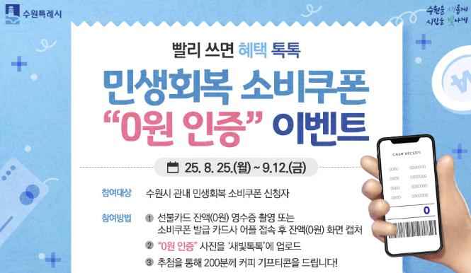 [뉴스스텝] 수원시가 민생회복 소비쿠폰 사용을 독려하기 위해 8월 25일부터 9월 12일까지 ‘0원 인증 이벤트’를 연다.