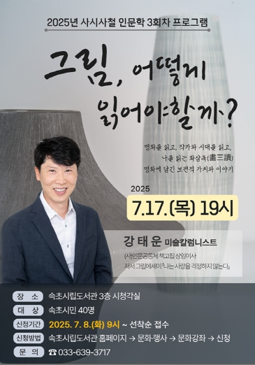 [뉴스스텝] 속초시립도서관은 7월 17일 19시 시청각실에서 속초시민 40여 명을 대상으로 사시사철 인문학 세 번째 프로그램 ‘그림, 어떻게 읽어야 할까?’를 진행한다.