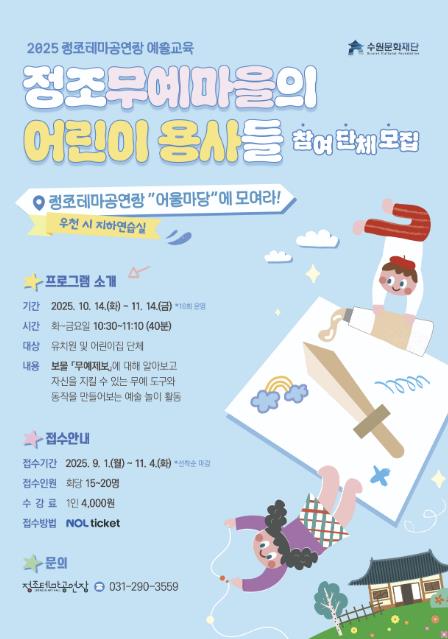 [뉴스스텝] 수원문화재단은 오는 10월 14일부터 11월 14일까지 정조테마공연장 어울마당에서 ‘2025 정조테마공연장 예술교육 '정조무예마을의 어린이 용사들'’을 진행한다.