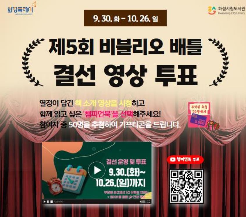 [뉴스스텝] 화성시문화관광재단은 오는 10월 26일까지 '제5회 비블리오 배틀' 결선 영상투표를 진행한다.