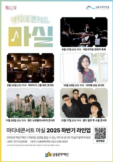 [뉴스스텝] 인천시 남동구 남동문화재단이 문화가 있는 날(매달 마지막 주 수요일) 오전 11시마다 5천 원에 만날 수 있는 남동소래아트홀 대표 상설 프로그램 ‘마티네콘서트 마실’의 2025년 하반기 라인업을 공개했다.