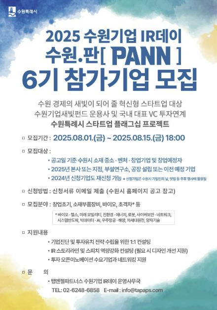[뉴스스텝] 수원시가 ‘2025 수원기업 IR데이 수원.판(PANN)1) 6기’에 참여할 기업을 8월 15일까지 모집한다.