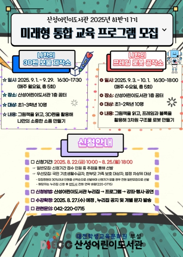 [뉴스스텝] 대전학생교육문화원(원장 엄기표) 부설 산성어린이도서관은 초등학생의 미래 역량 향상을 위한 '미래형 통합 교육 프로그램'을 오는 9월부터 세 달간 총 20회에 걸쳐 운영한다고 밝혔다.