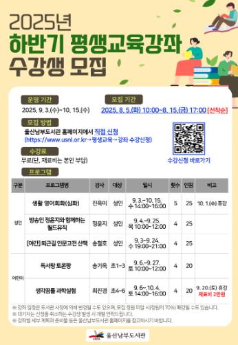 [뉴스스텝] 울산남부도서관은 초등학생과 지역 주민을 대상으로 2025년 하반기 평생교육 강좌 수강생 115명을 모집한다.