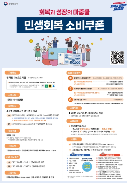 정부는 소비를 활성화하고 소상공인·자영업자의 매출을 늘려 민생경제를 회복하기 위해 전 국민에게 민생회복 소비쿠폰을 지급한다.