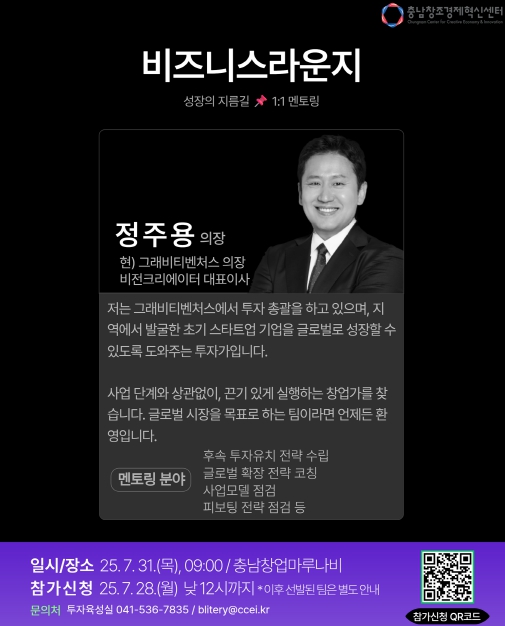 정주용 의장은 지역에서 발굴한 초기 스타트업의 글로벌 확장을 돕는 투자 전문가로, 후속 투자 유치 전략, 글로벌 확장 전략 코칭, 사업모델 점검, 피보팅 전략 등 실전 중심의 밀착 멘토링을 제공할 예정이다.