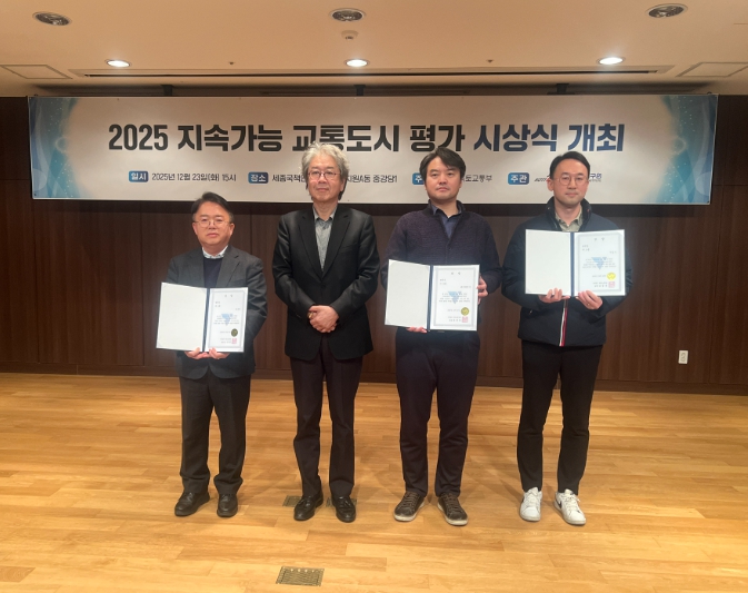 | ▲ 2025 대중교통 시책평가서 종합평가 우수지자체·행복콜버스 우수시책 선정, 지속가능 교통도시 발전상 수상 |