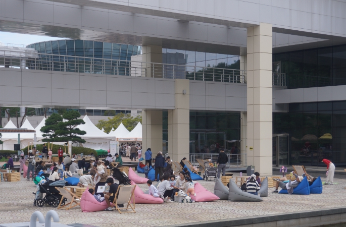 버들광장에 조성된 야외도서관에는 텐트와 빈백, 캠핑테이블이 마련돼 있어 시민들이 책과 공연, 휴식을 함께 즐길 수 있다.