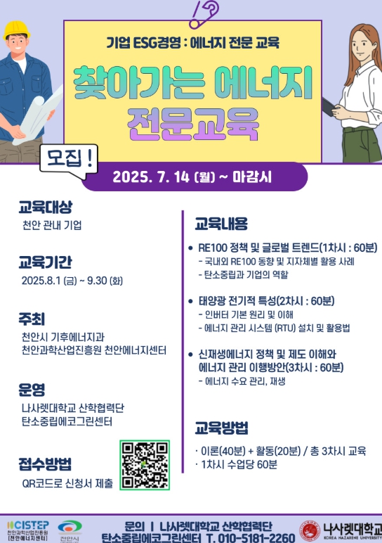 나사렛대학교 산학협력단에서 운영을 맡아 ▲RE100 정책 및 글로벌 트렌드 ▲태양광 신재생에너지 전기적 특성 ▲신재생에너지 정책 및 제도 이해와 에너지 관리 이행방안 등에 대해 지도할 예정이다.