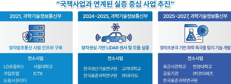 우리나라는 2023년 ‘국가 양자전략’을 통해 2035년까지 양자 강국 도약을 목표로 양자컴퓨팅·통신·센싱 3대 분야 집중 육성 계획을 수립했으며, 2024년에는 '양자과학기술 및 양자산업 육성에 관한 법률'을 제정해 국가 차원의 R·D·산업화·인력양성 체계를 마련하는 등 산업 적용이 빠르게 진전되고 있다.