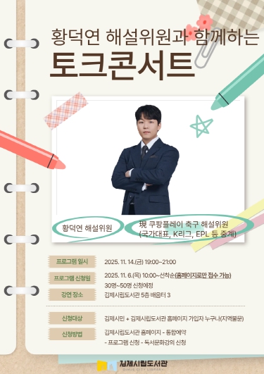 [뉴스스텝] 김제시립도서관은 오는 14일 금요일 19시부터 도서관 5층 배움터 3에서 ‘황덕연 해설위원과 함께하는 토크콘서트 내 꿈을 읽는 도서관’을 진행한다고 밝혔다