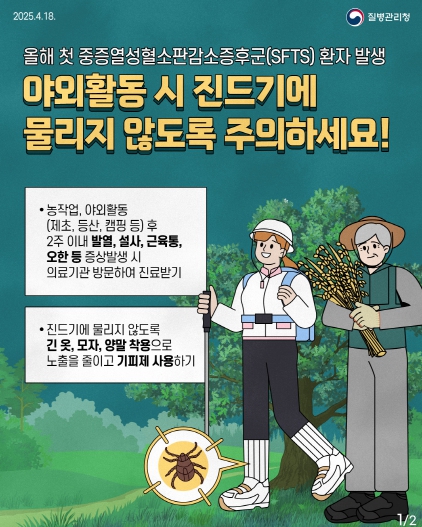 이에 따라 보건소는 농작업이나 야외활동 시 △긴 옷, 모자, 양말 착용 등으로 피부 노출을 최소화하고 △진드기 기피제 사용 △야외활동 후 샤워 및 옷 세탁 등을 반드시 실천할 것을 강조하고 있다.
